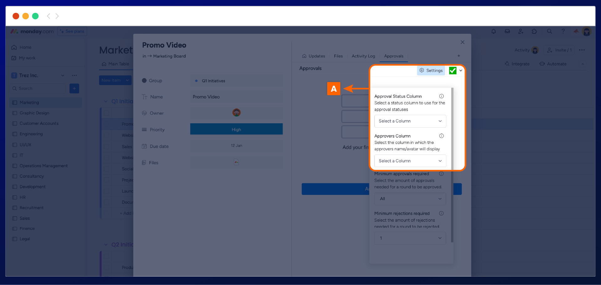 To start the process, Ava navigates to the Approvals for monday.com settings within an item on her board. She then creates a new column for the approval status and approver column (A).