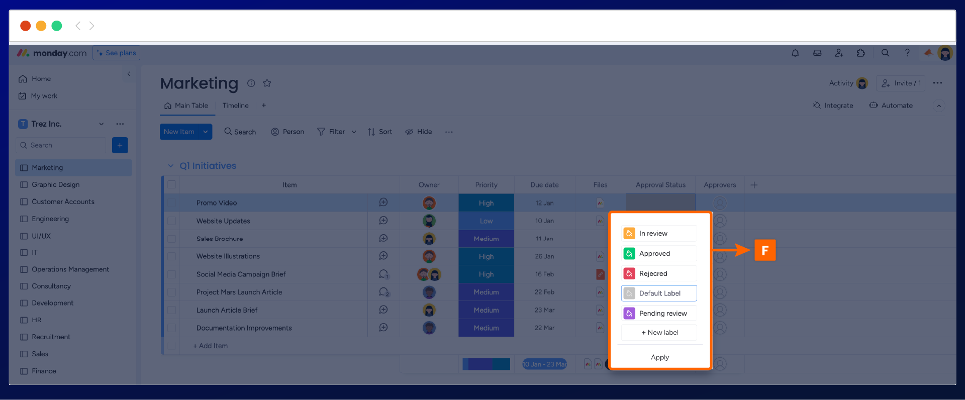 Now that your approval columns (G) have been added and the status labels have been renamed. You can now easily monitor all approvals that have been added to any item straight from your main board.