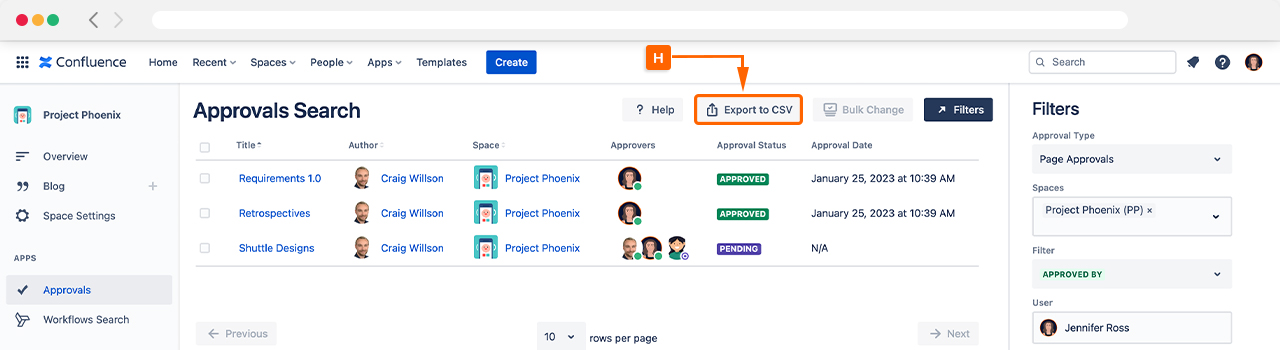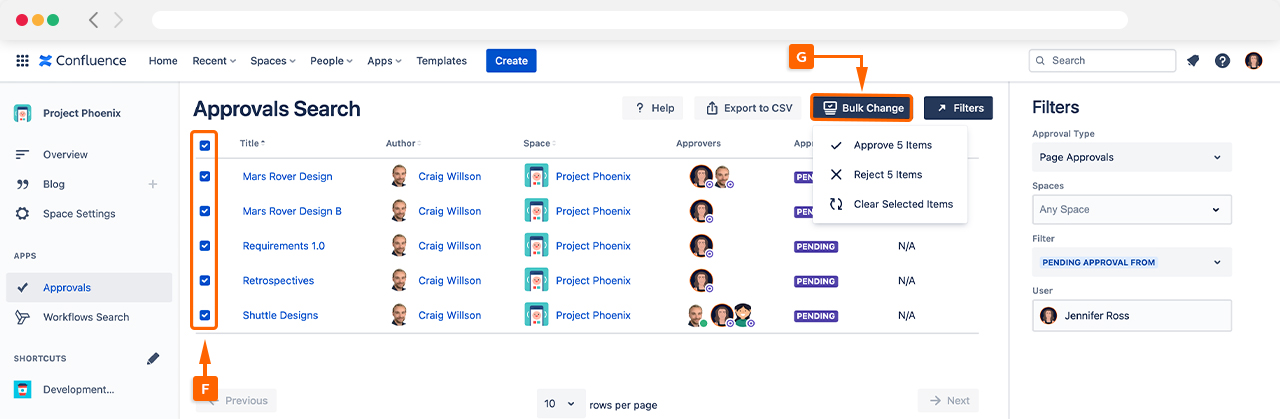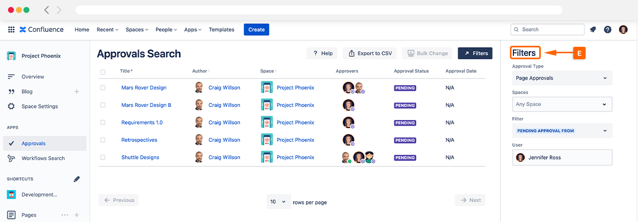 If you have many pages using Approvals or have a specific interest, you can use the Filters (E) to narrow your search.