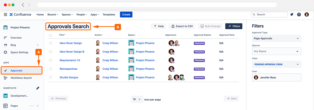 To access the Approvals Search in Approvals for Confluence, click Approvals (A) in the left-hand navigation within Confluence. This will open the Approvals Search (B), as shown below.