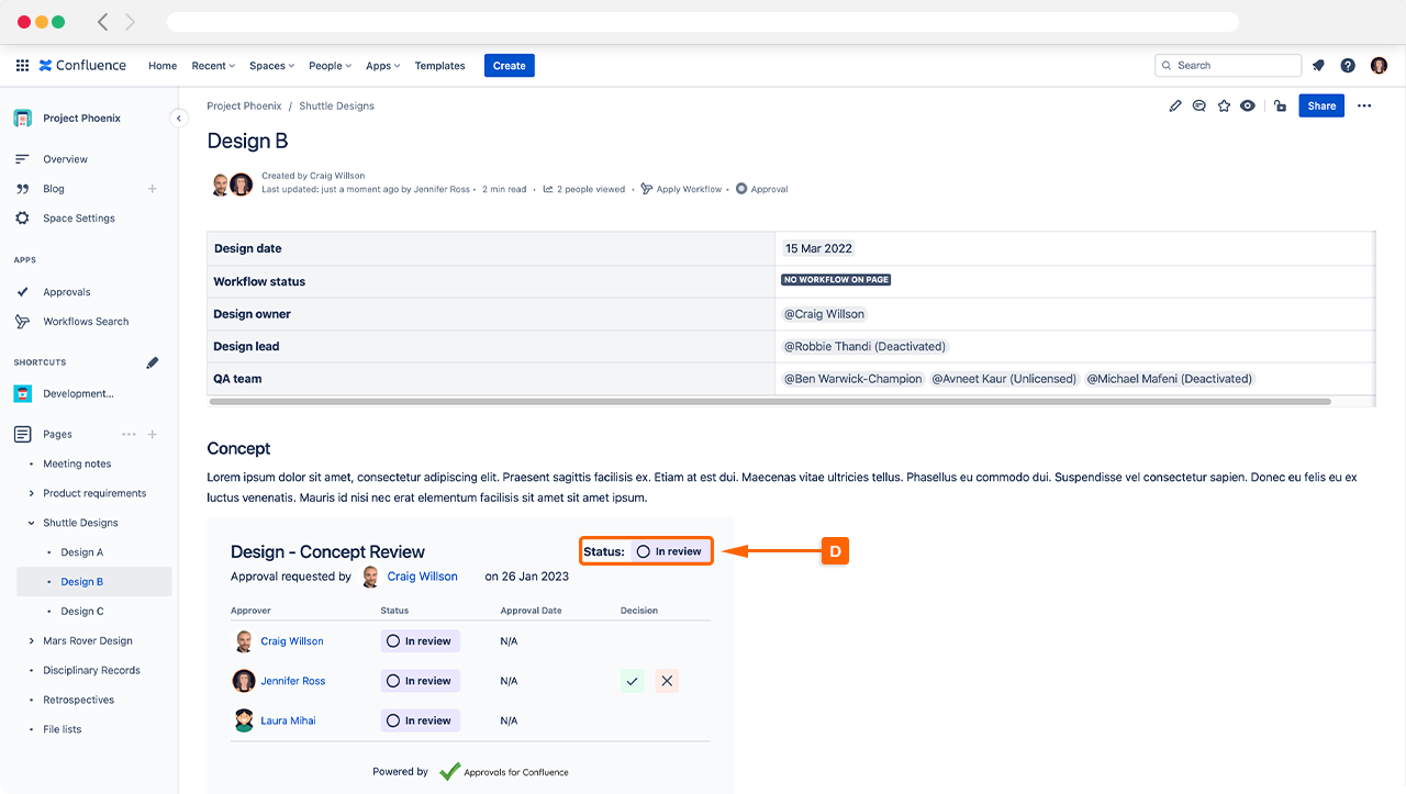 Now that Brian has set-up the approval as needed and is saved, he publishes the Confluence Page where the section approval status is in review (D), and the approvers will be notified to action the approval.