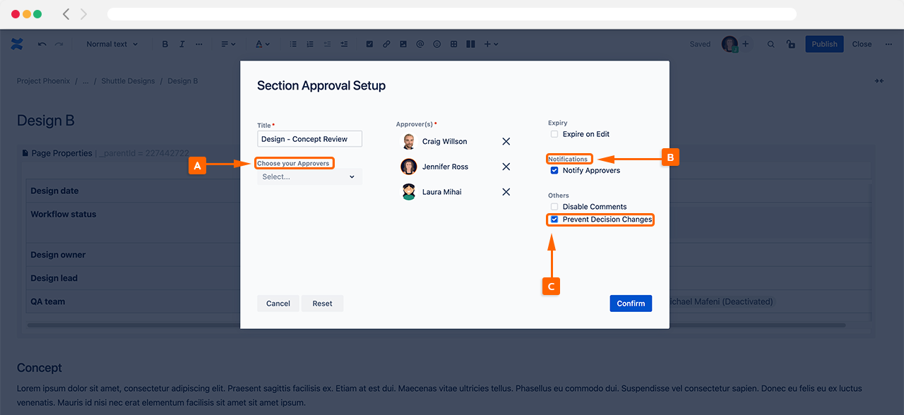 After creating the project document, Brian uses Approvals for Confluence to add [section approvals] to each phase of the project. This adds a review and approval process to different sections of the Confluence page.