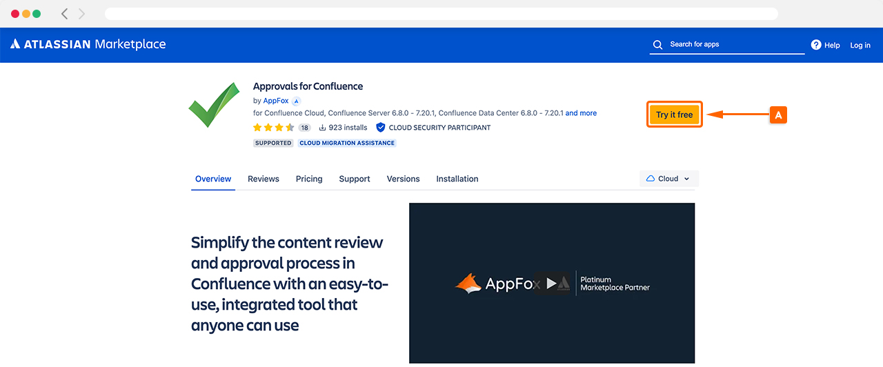 Visit the Approvals for Confluence product page on the Atlassian Marketplace and select Try it free (A) as shown below.