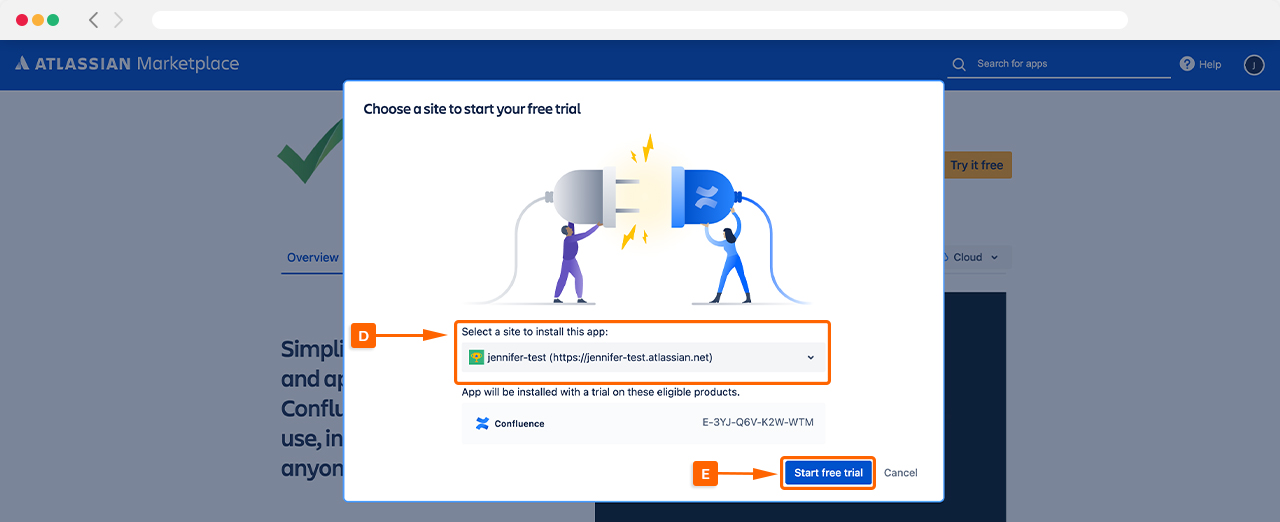 You will need to select which site to install Approvals for Confluence on using the drop-down menu (D). Once selected, click Start free trial (E) and Approvals for Confluence will be installed on that Confluence instance.