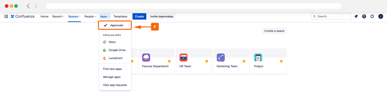 Once installed, you can access Approvals for Confluence using the Apps menu (F), as shown below.