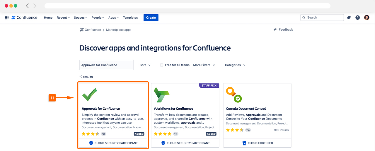 Search for “Approvals for Confluence” and the app should appear in the search results (H).