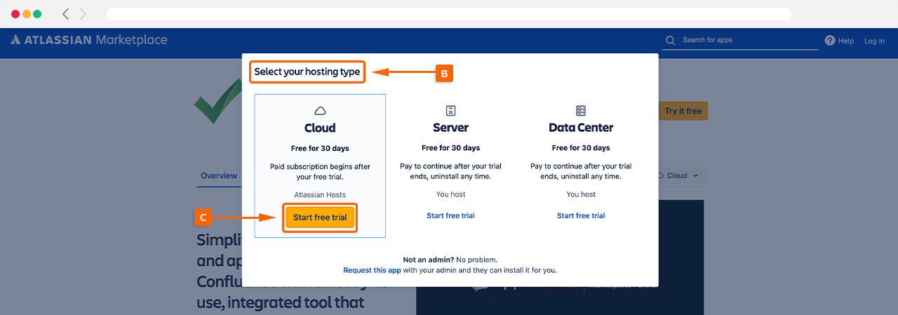 This will then ask you to ‘Select your hosting type’ (B). In this example, we’ll focus on the Cloud hosting type so select Start free trial under the Cloud hosting type (C).