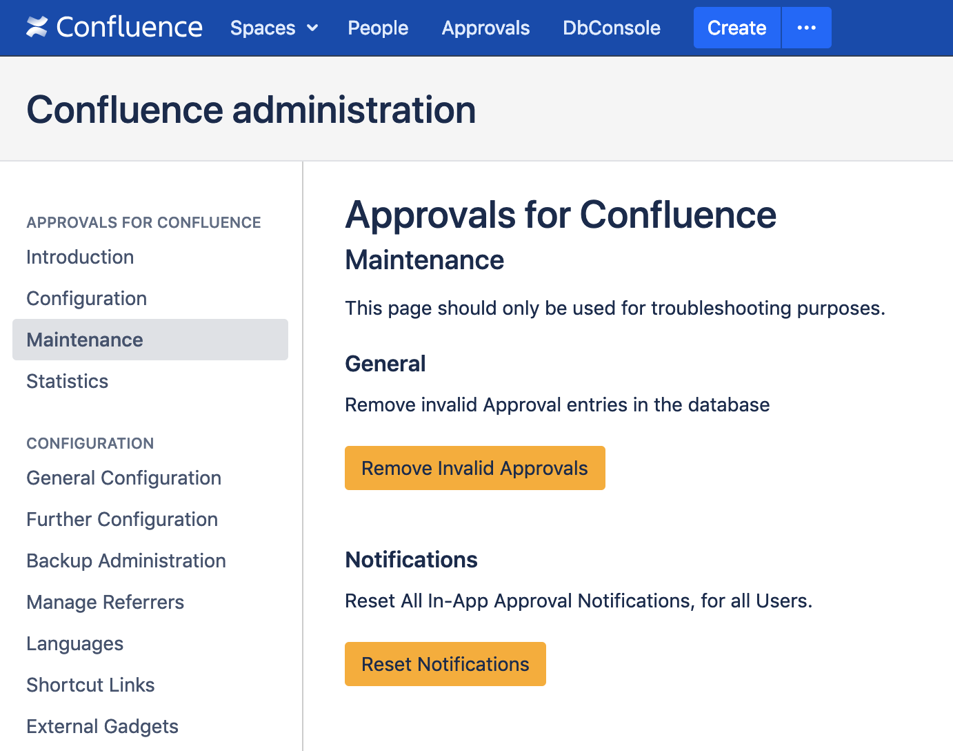 In rare circumstances you may need to perform troubleshooting on Approvals for Confluence. There are some tools you can use below but please feel free to contact our support team if you are having problems and we will be happy to help.