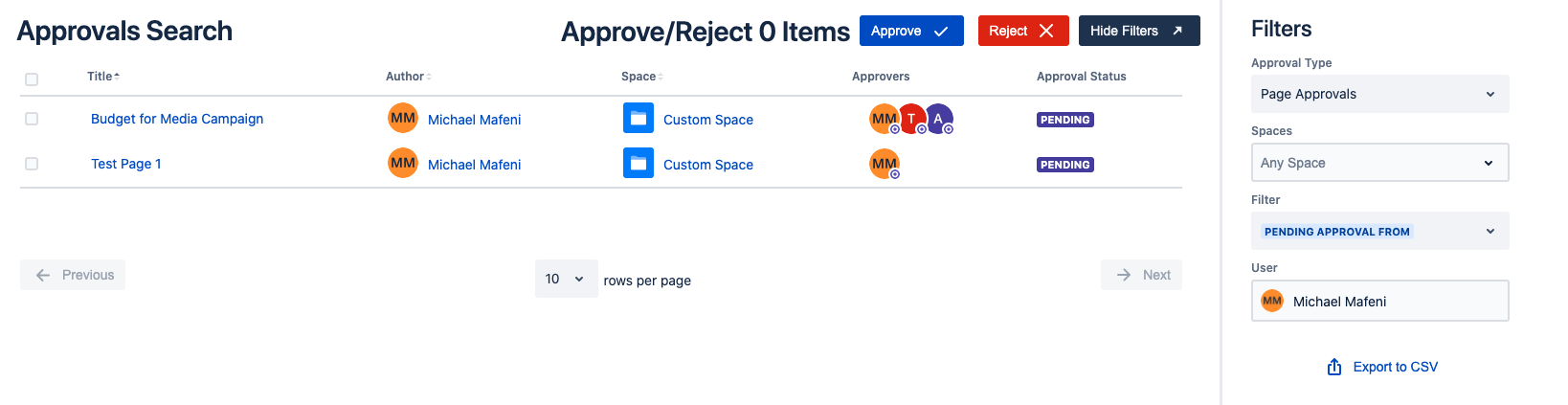 Tim could view all his pending approvals by going through his emails but this is very time consuming and can be quite tedious. Instead, Using Approvals for Confluence, Tim can easily find his pending approvals by heading to the Approvals Search page. Using the filters, Tim easily finds his pending approvals.