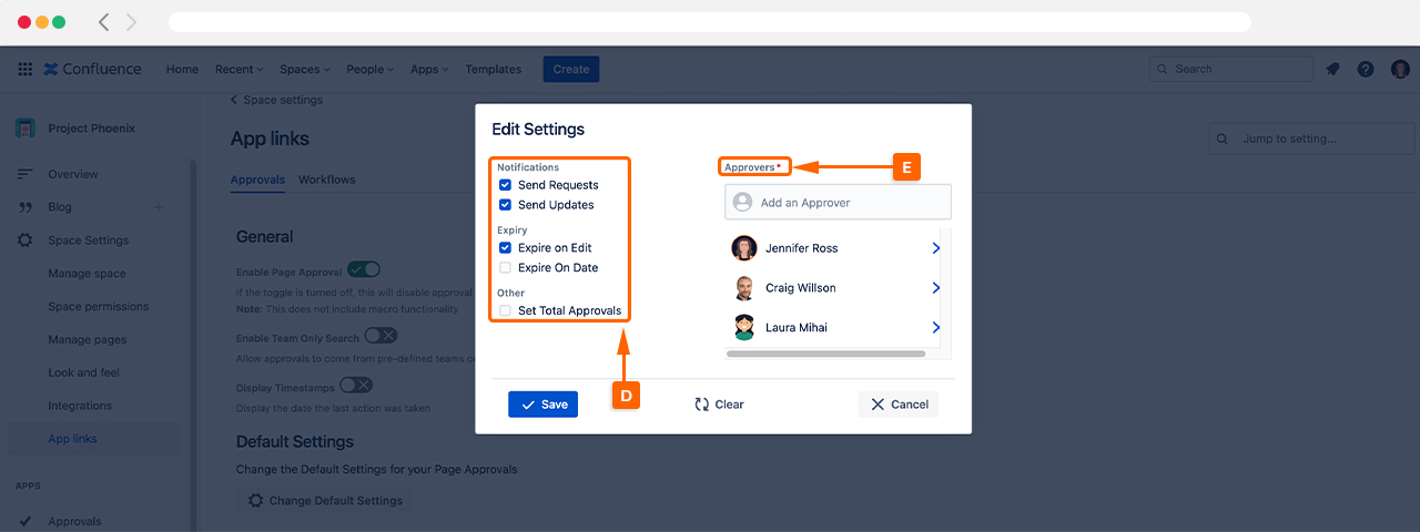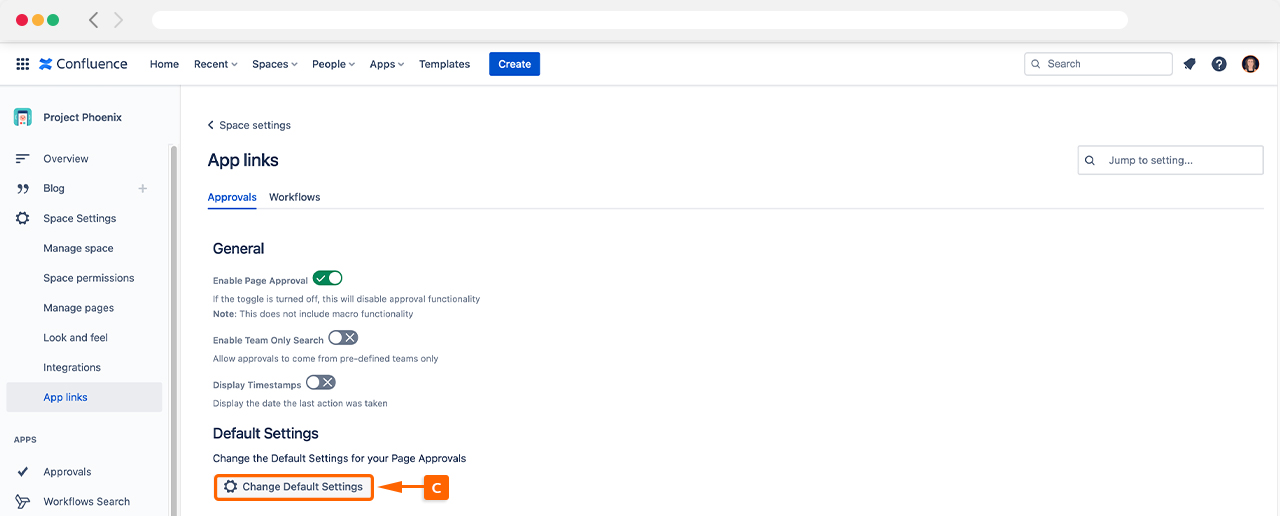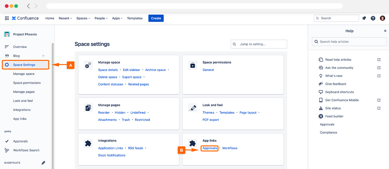 To customize the Default Page Approval settings, start by navigating to Space Settings (A) and then click Approvals under App links (B).