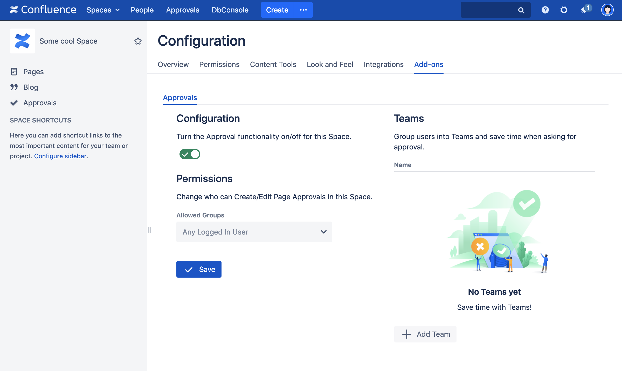 Approvals for DC/Server allows you to configure settings per space. To access the settings, click on Space Tools (located on the bottom left) and select the Add-ons item.