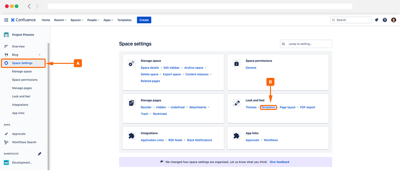 To use an Approval Macro in a template, start by creating a Confluence Template by accessing the Space Settings (A), navigating to Look and feel, and clicking Template (B).