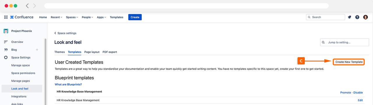 Once the Template window has opened, navigate to create a new template (C), this will navigate you to a confluence page where you can start customizing your template.