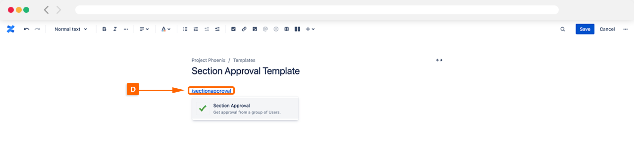 Next, add a Section Approval Macro by typing ‘/sectionapproval’ (D).
