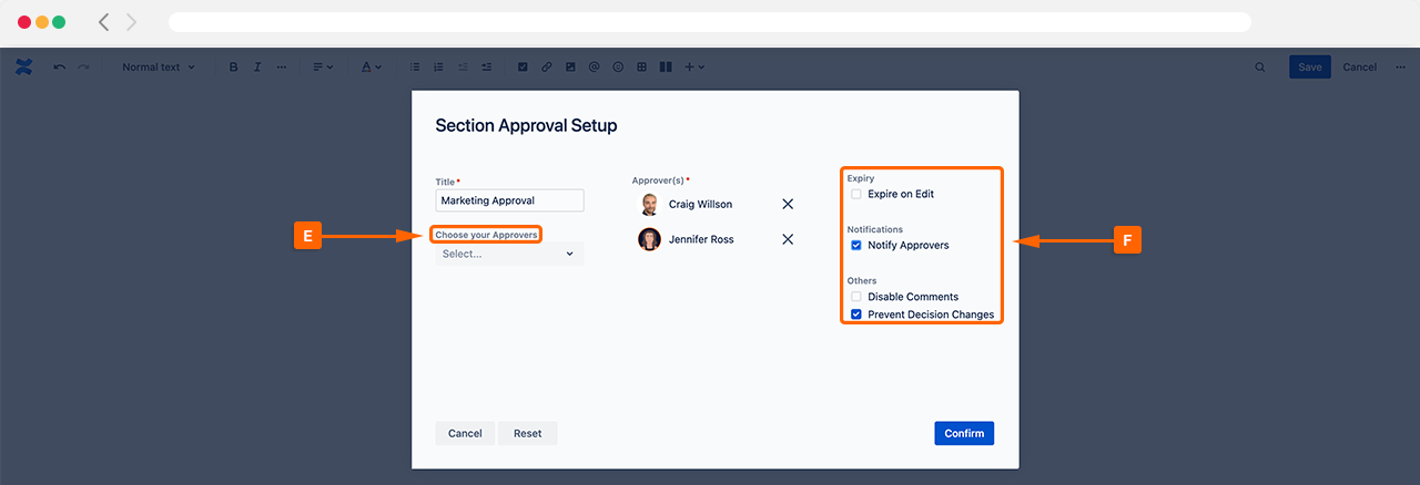 Next, choose the relevant Approvers (E) you want to add to the template and start configuring the settings (F). Once you are happy with your selection, click Confirm to confirm your changes.