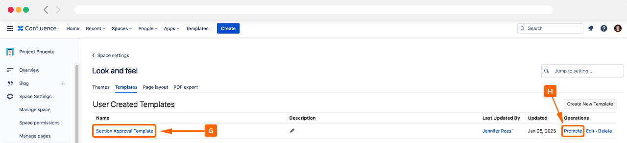Once the section approval is confirmed, save the confluence page, which will be added under User Created Templates (G). When you create new pages in Confluence, you can easily find your section approval template by clicking promote (H) under operations.