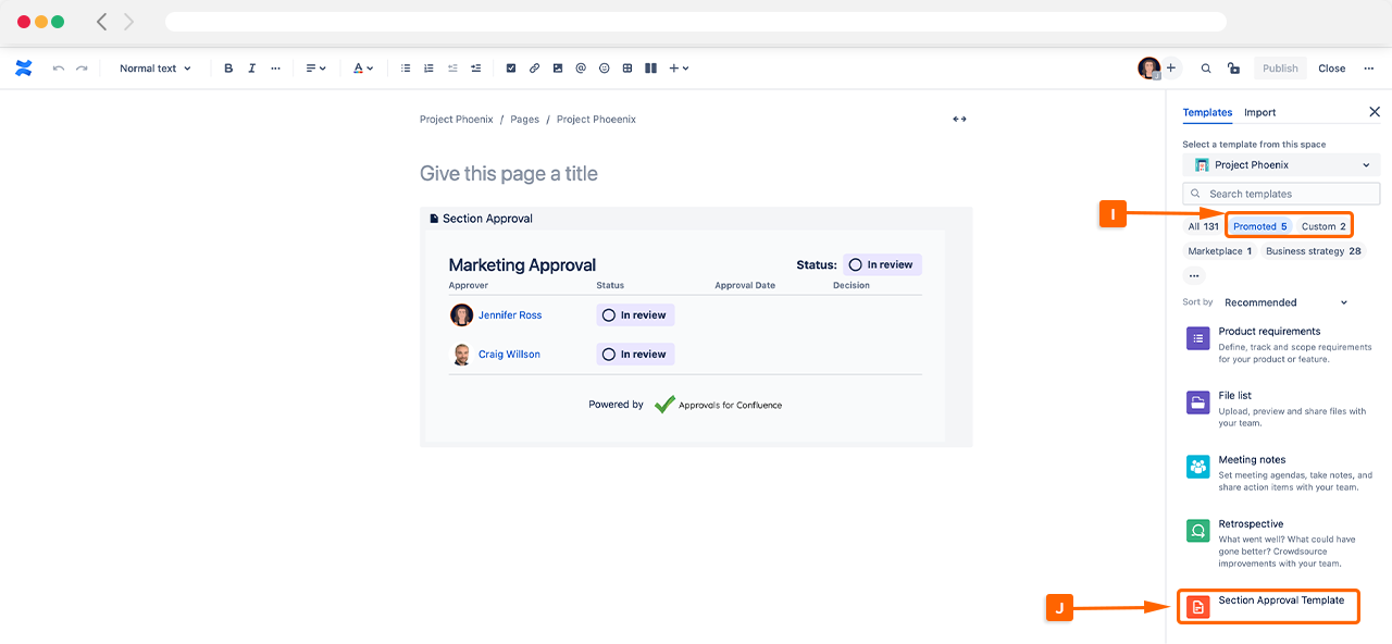 When creating a new page in Confluence and selecting one of the templates in the left-hand column, you can easily find your Section Approval template by clicking promoted or custom (I), to find the pre-configured section approval template (J). The approval will be automatically added to the page, saving time than setting up a new section approval.