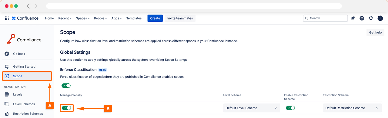 Apply a single Level Scheme to your entire confluence by ensuring the Manage Globally (B) toggle is activated. This will allow you to select a Level Scheme you have created.
