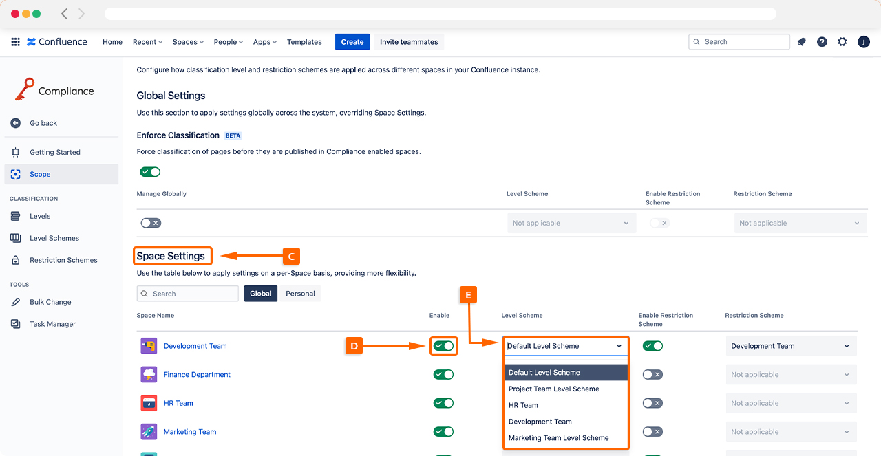 Next, find the space(s) you want to apply Level Schemes to and ensure the Enable (D) option is activated. Now you can select the Level Schemes (E) you have created from the drop-down menu. Once a Level Scheme has been selected, it will be automatically applied to this space in Confluence.