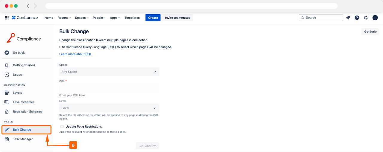 Once Compliance for Confluence has loaded, click Settings in the left navigation bar and then Bulk Change (B).