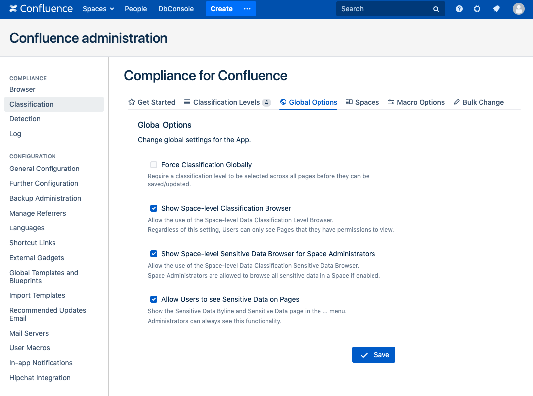 This setting allows you to toggle the Force Classification feature for the entire site. This means instead of having to toggle it for each space, simply use this approach to do it globally.