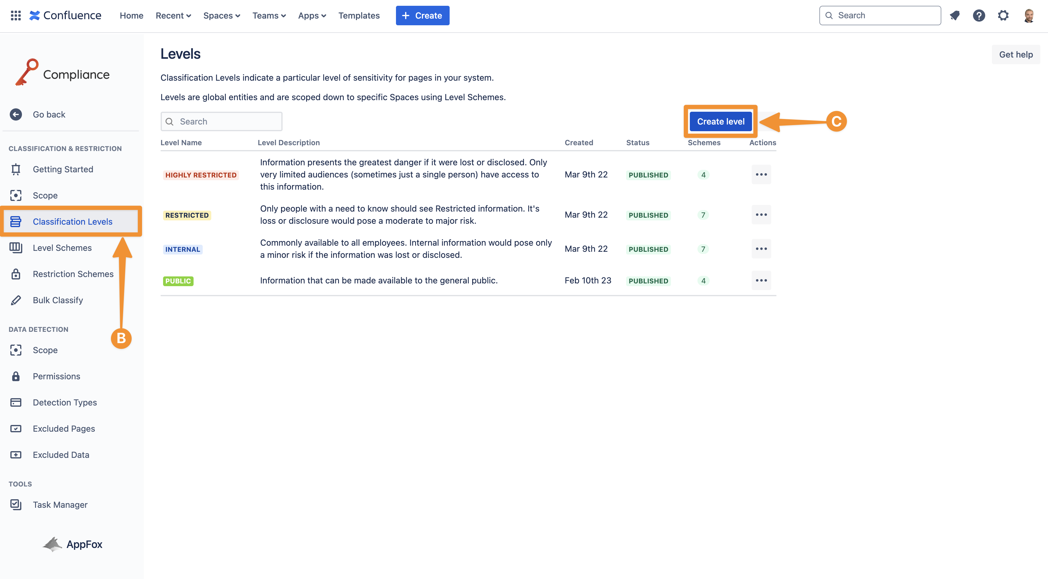 Once you’re in the settings, navigate to Classification Levels (B) to open the configuration settings and create custom Classification levels (C).
