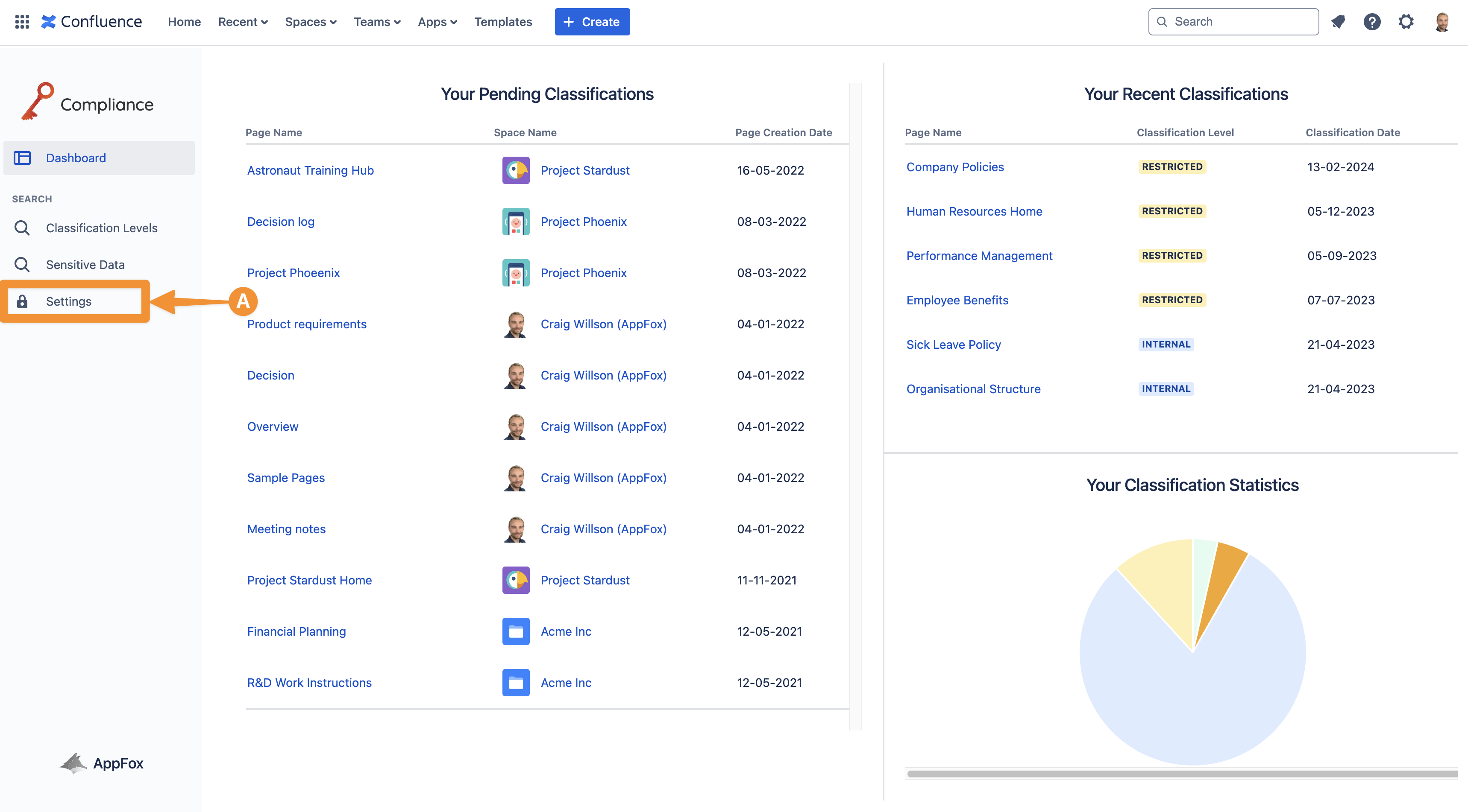 To create a new classification level, access Settings (A) in the left-hand navigation bar.