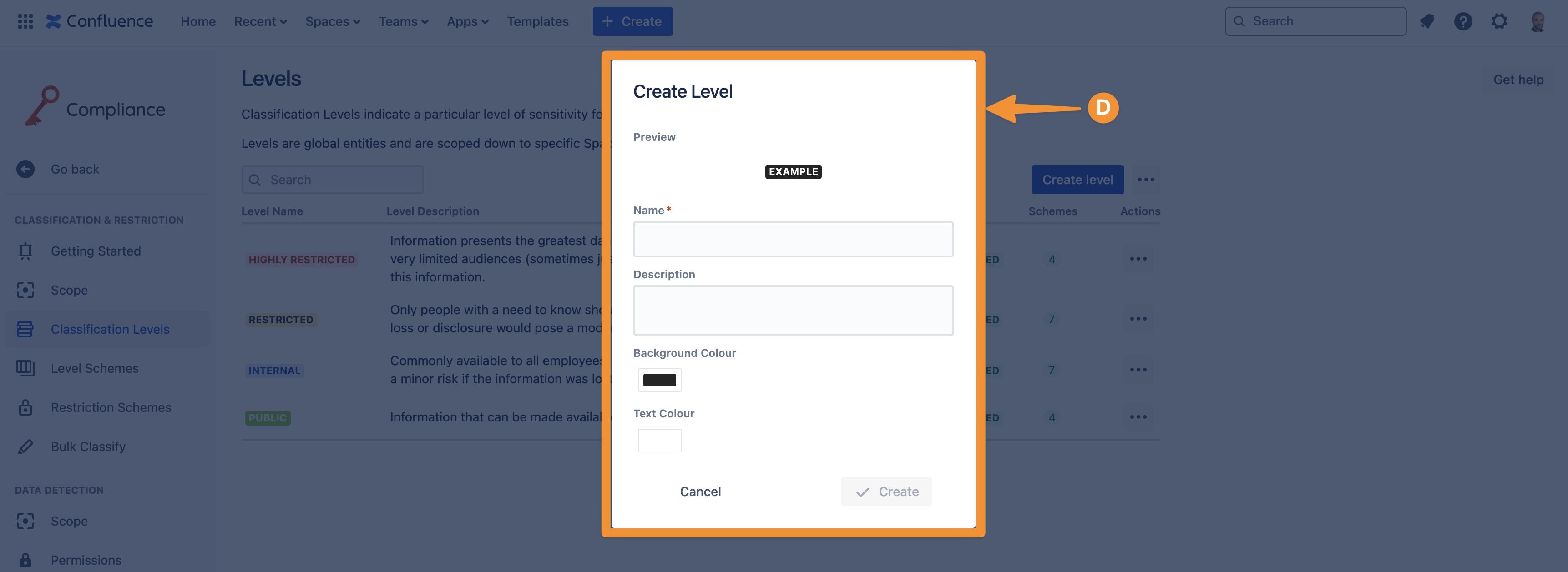 Confluence users will be able to see the name, description, and colors of the classification levels so be sure to choose something your colleagues will understand.
