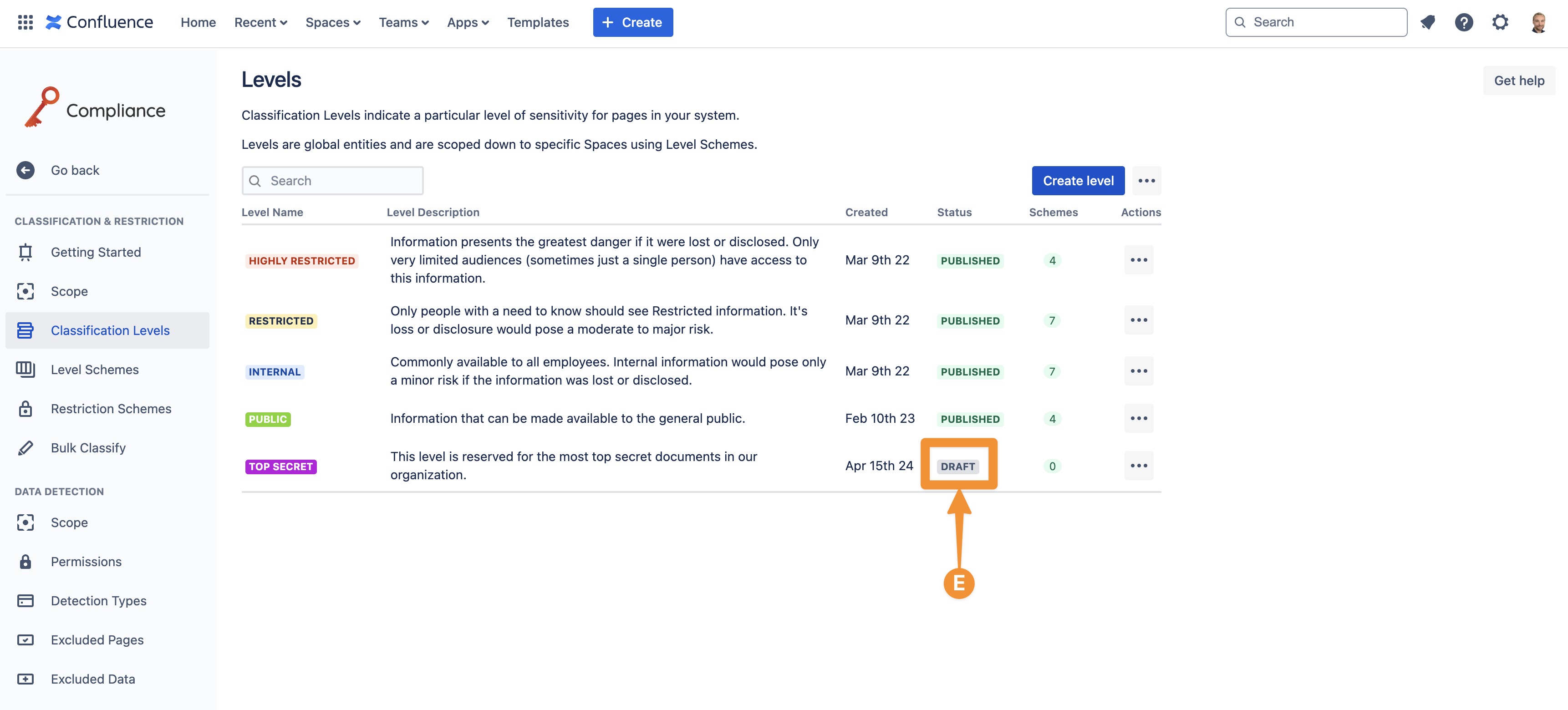 Once you are happy with the classification level, click Create, and this will be added to the levels page as a draft (E) level.