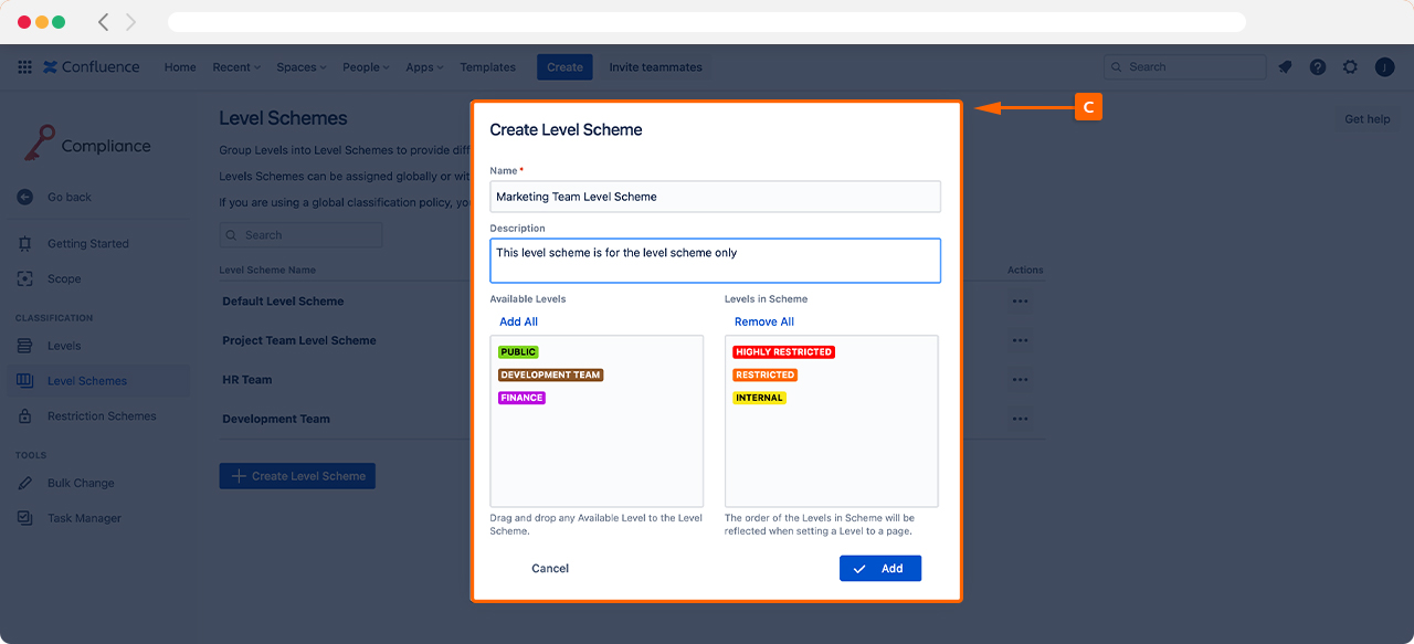 Once the “Create Level Scheme” (C) Window has opened, you can start customing your level scheme. Add a name and description to the level scheme and customize which classification levels you want to include in the level scheme with the drag-and-drop feature.