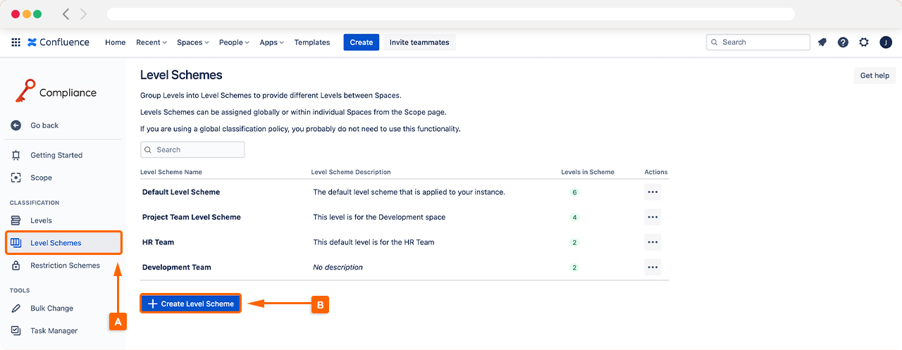 To start creating your Level Schemes, access Settings in the left-hand navigation bar within Compliance. Next, navigate to the Level Schemes (A), which will display default levels schemes. To create your, click on ‘+ Create Level Scheme’ (B).