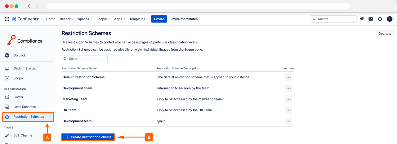 To start creating a Restriction Scheme, access the Restriction Schemes (A) within Compliance. Here you will see the Default Restriction Scheme, which can be used to apply consistent restrictions across your entire Confluence instance. However, if you prefer to create custom Restriction Schemes, start by clicking + Create Restriction Scheme (B).
