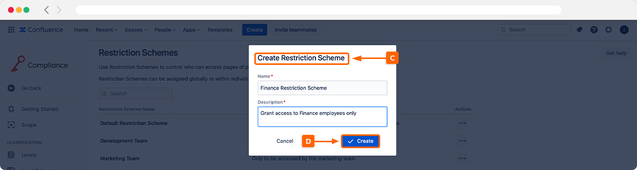 Next, once the ‘Create Restriction Scheme’ (C) window opens, you can start customizing our Restriction Scheme to differentiate from others. This is useful if you have many Confluence admins who use Compliance. Once happy, click Create (D).