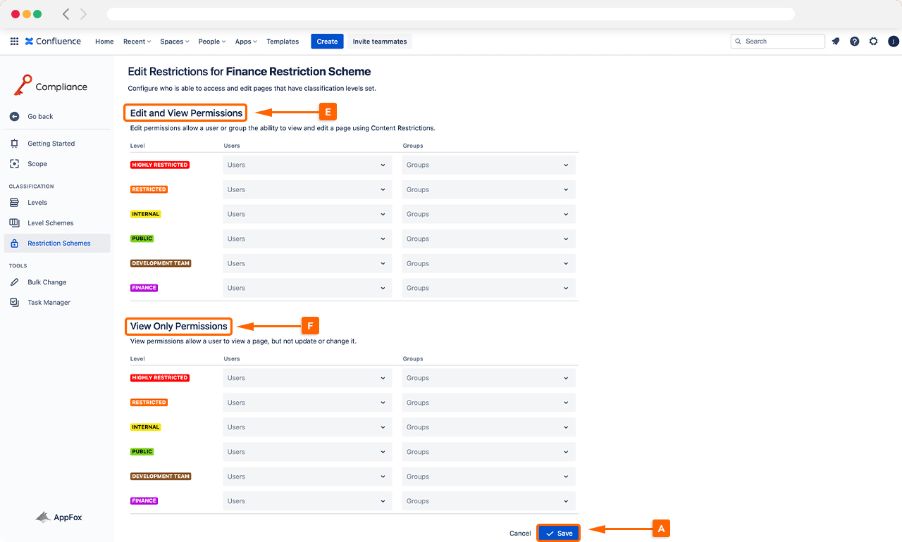 Once you have selected the users and groups that need view and/or view and edit permissions, click Save (G), and this Restriction Scheme is ready to be applied to Confluence. You can manage how a Restriction Scheme is applied using the Scope settings.