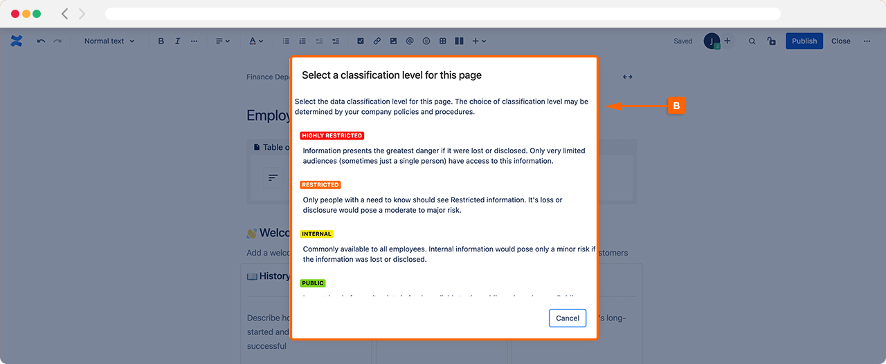 Once Enforce Classification is enabled, if any user tries to publish or save a Confluence page, they will be presented with ‘Select a classification level for this page (B). Users will not be able to proceed with publishing or saving a page until they have selected a data classification level that is displayed.