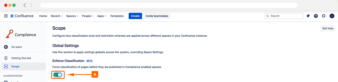 Once you’re in scope, navigate Enforce Classification (A), and turn the toggle on. This will now be active across all Confluence spaces with Compliance for Confluence enabled.