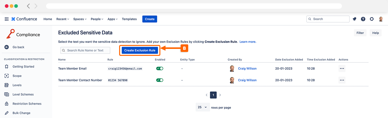 Once created, this exclusion rule is active, and Compliance for Confluence will no longer detect the text that matches this rule.