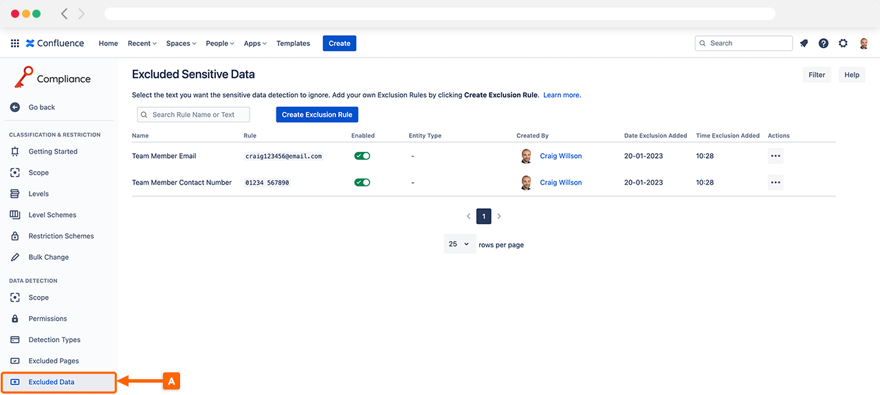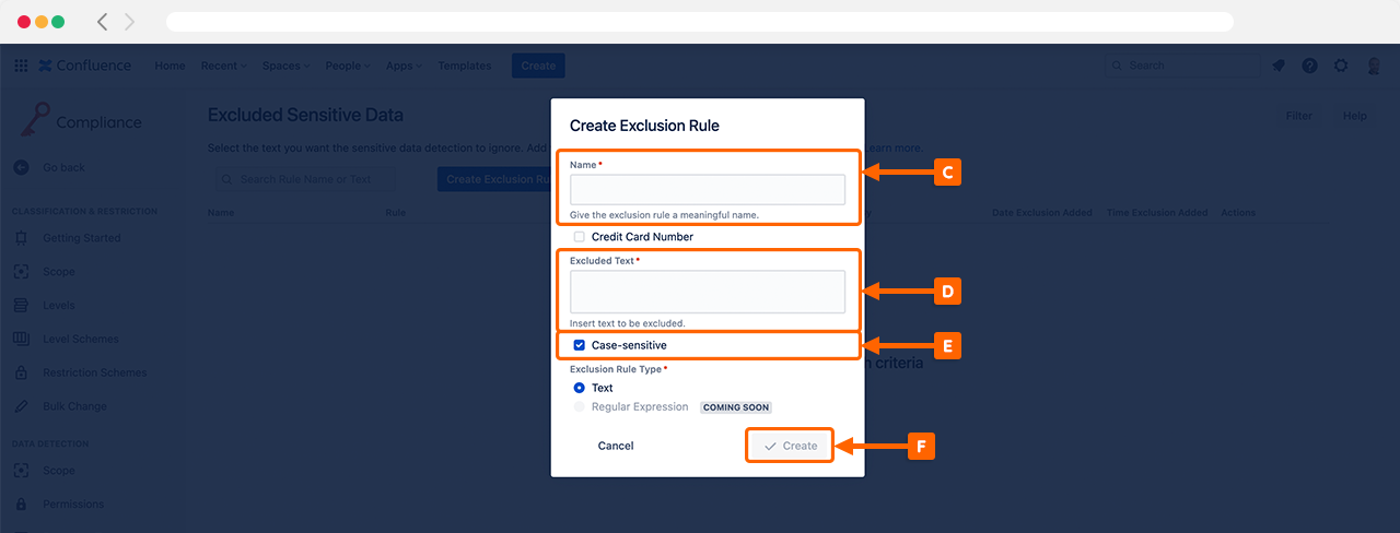 To access the Excluded Data rules settings in Compliance for Confluence, navigate to the Excluded Data (A) settings in Compliance for Confluence.