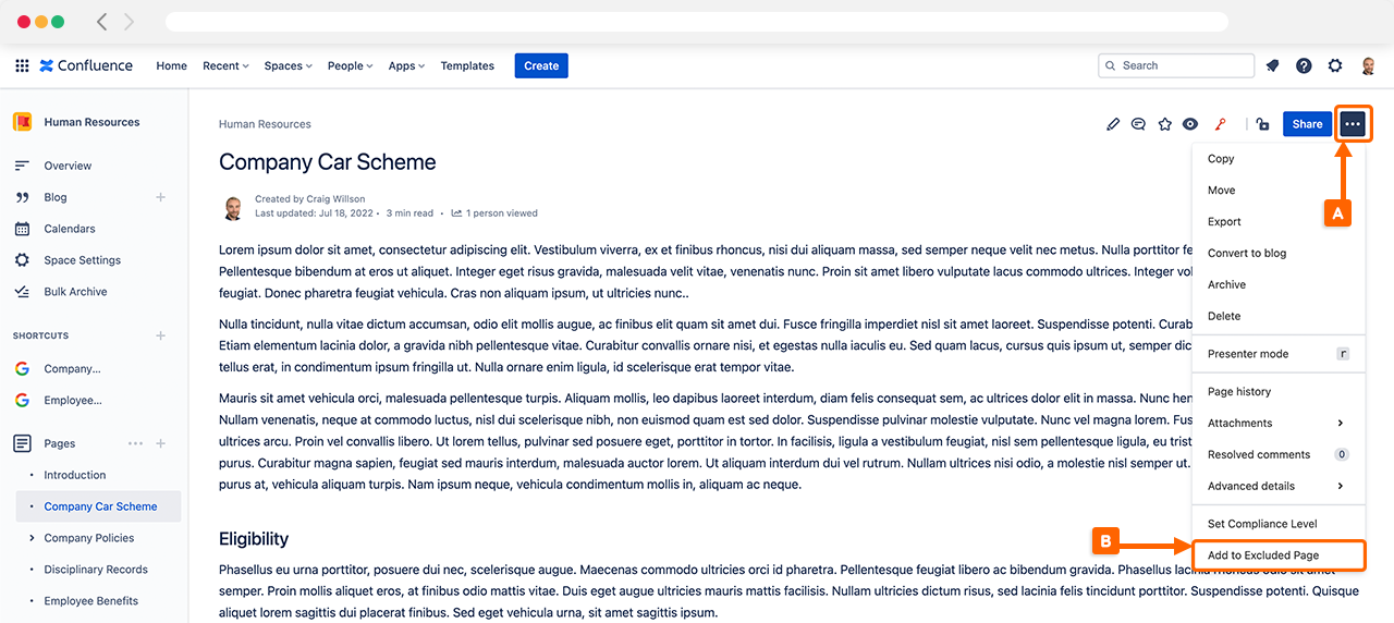 To add a page to the Excluded Pages list, you first need to navigate to the Confluence page itself. Once on the page, open the “…” menu (A) and select Add to Excluded Page (B).