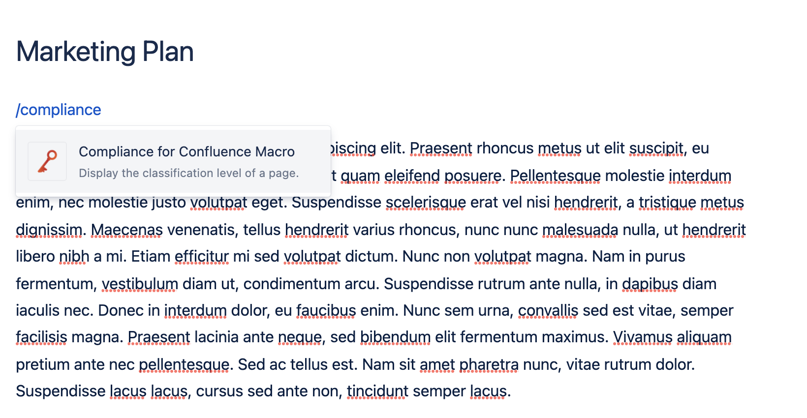 Start by editing the page and typing /compliance which will display the Compliance for Confluence Macro (shown below) that you must add to the page.