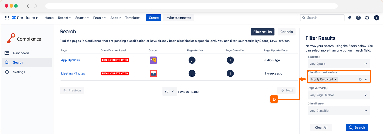 After accessing the search, you may see a number of your existing pages display here. You can use the filters in the Filter Results section to narrow your search. For example, if you want to find pages classified as Restricted, select this classification level in the Classification Level(s) filter (B).