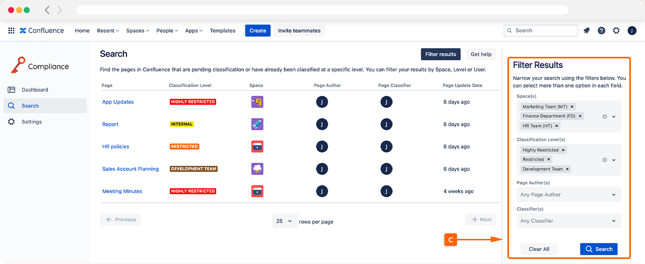 There are additional filters that can be applied to help your search in Compliance for Confluence. These Filters (C) include: