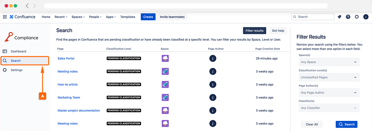 Open the Compliance for Confluence app by clicking Apps in the top navigation bar and then Compliance in the drop-down menu that appears. Once inside the app you will see Search (A) in the left-hand navigation bar.