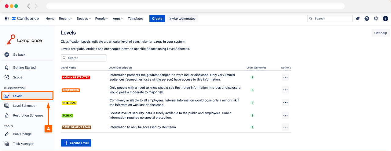 Classification levels are applied throughout Confluence using Level Schemes (B). Before creating a Level Scheme, you must decide whether your organization wants one set of classification levels for your entire Confluence instance or if you want to have different classification levels available across your spaces.