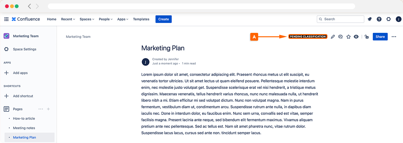 Classification levels are a core feature in Compliance for Confluence, and these can be easily added to pages based on the types of data or information they contain. Once a Classification Level (A) has been selected, it will be displayed at the top of a page, making it visible for everyone.