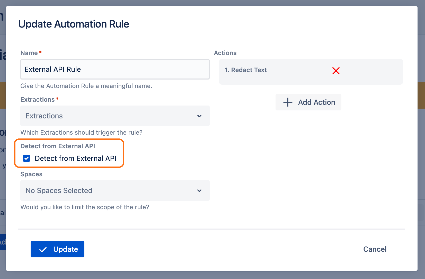 To set up an Automation Rule, please refer to the Automation page. When setting up an Automation Rule, you can check the Detect from External API checkbox. Please ensure you have enabled and configured your API with Compliance for Confluence beforehand.
