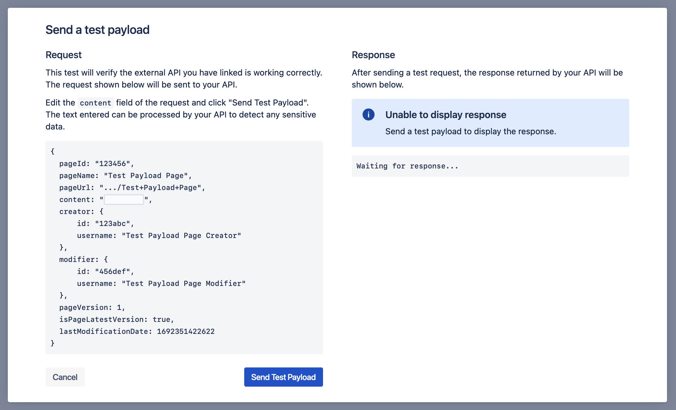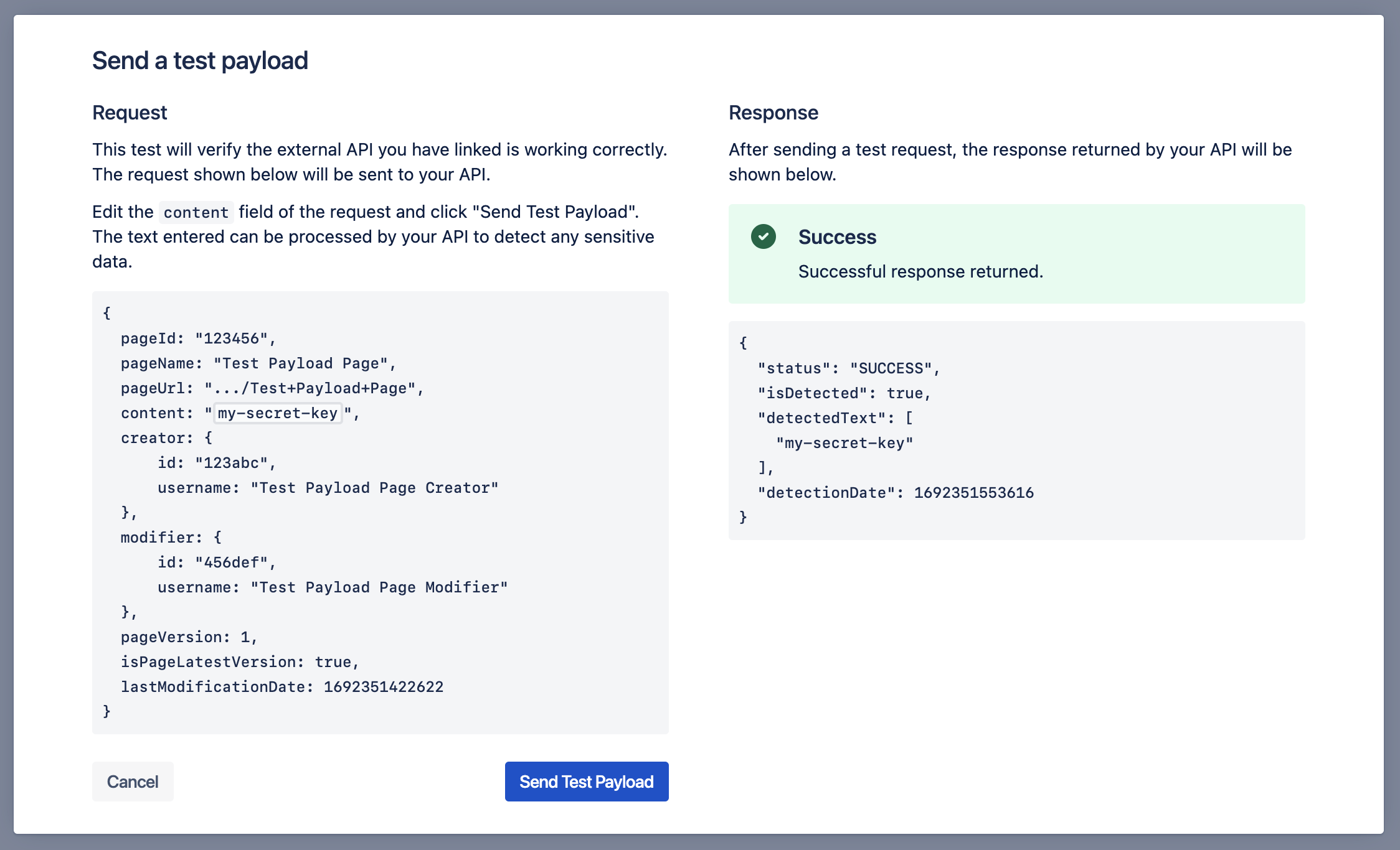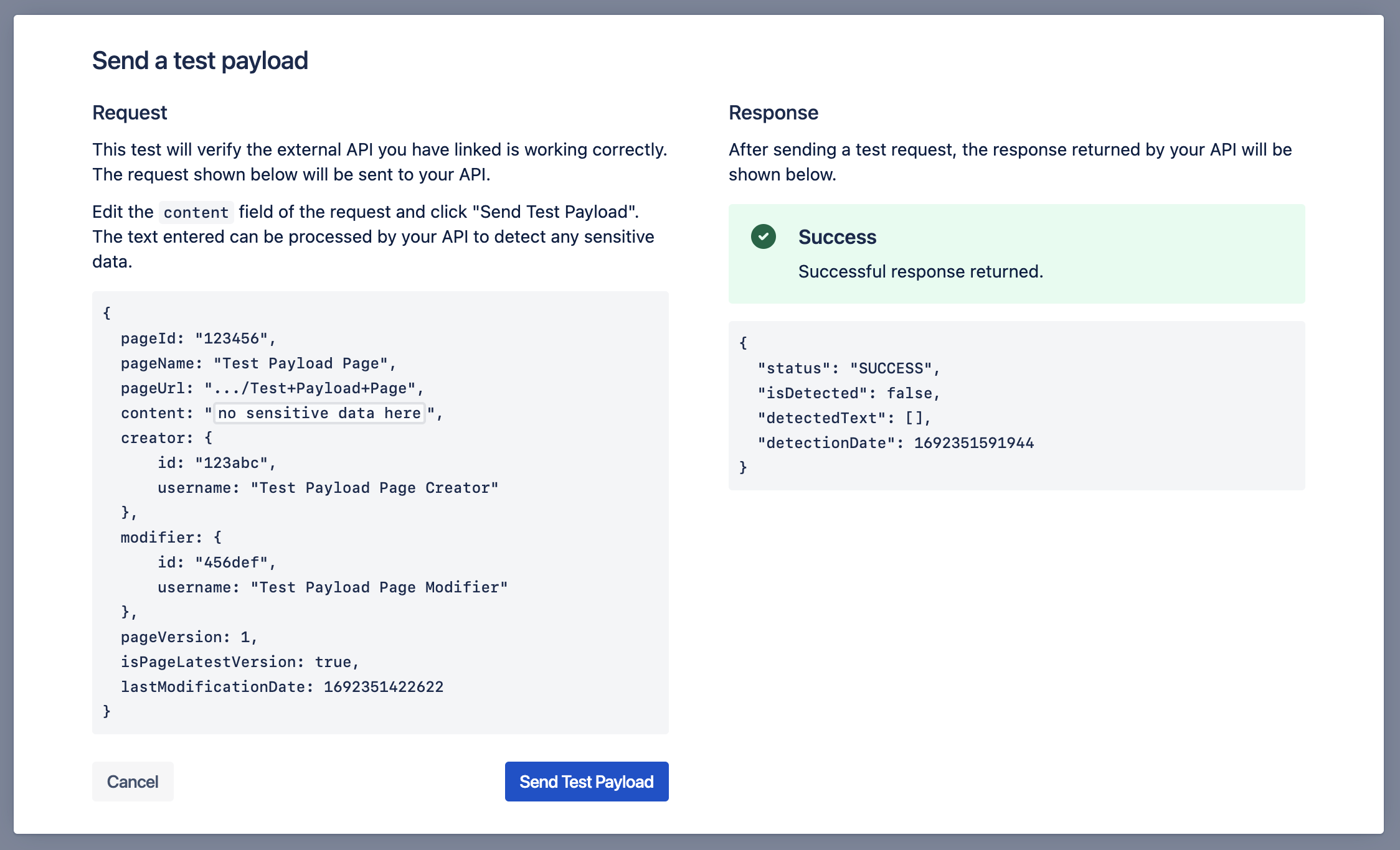 After enabling and configuring an External API from within Compliance for Confluence, you can send a test payload to your API to verify its response. If you have not yet configured your API, please refer to Using an External API for Data Detection.