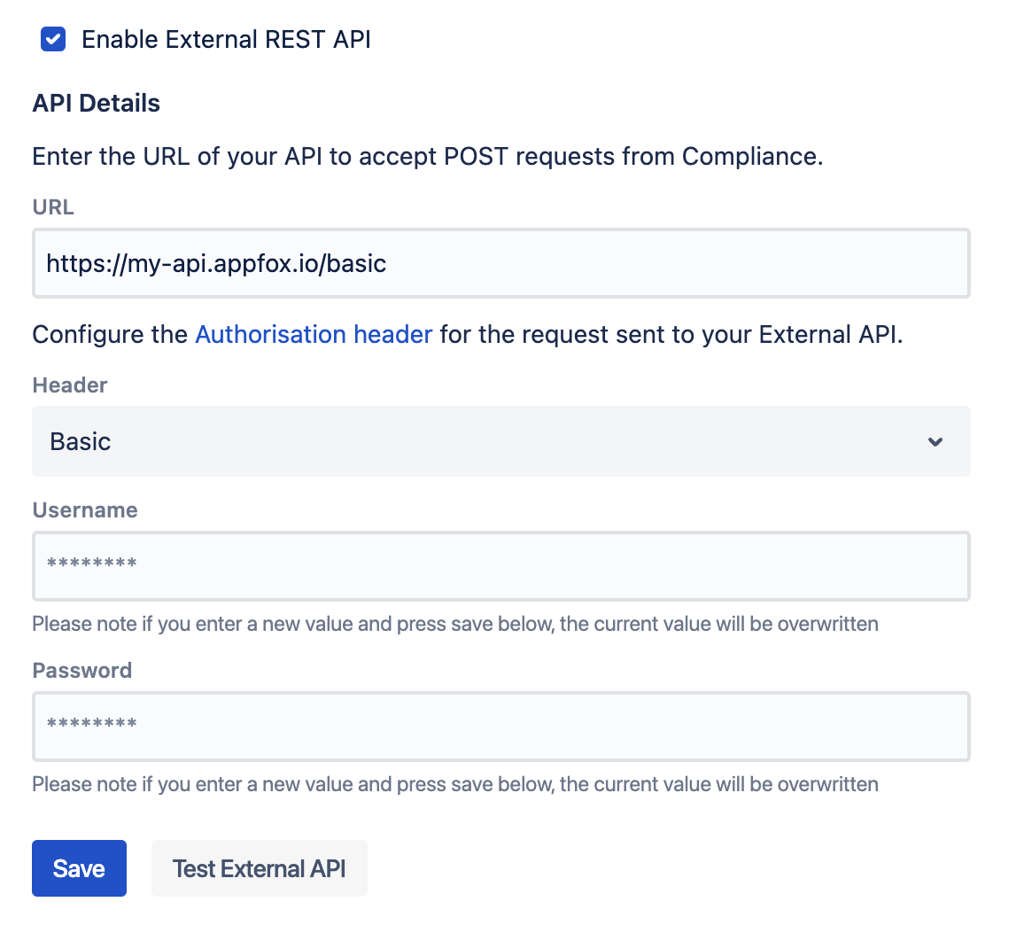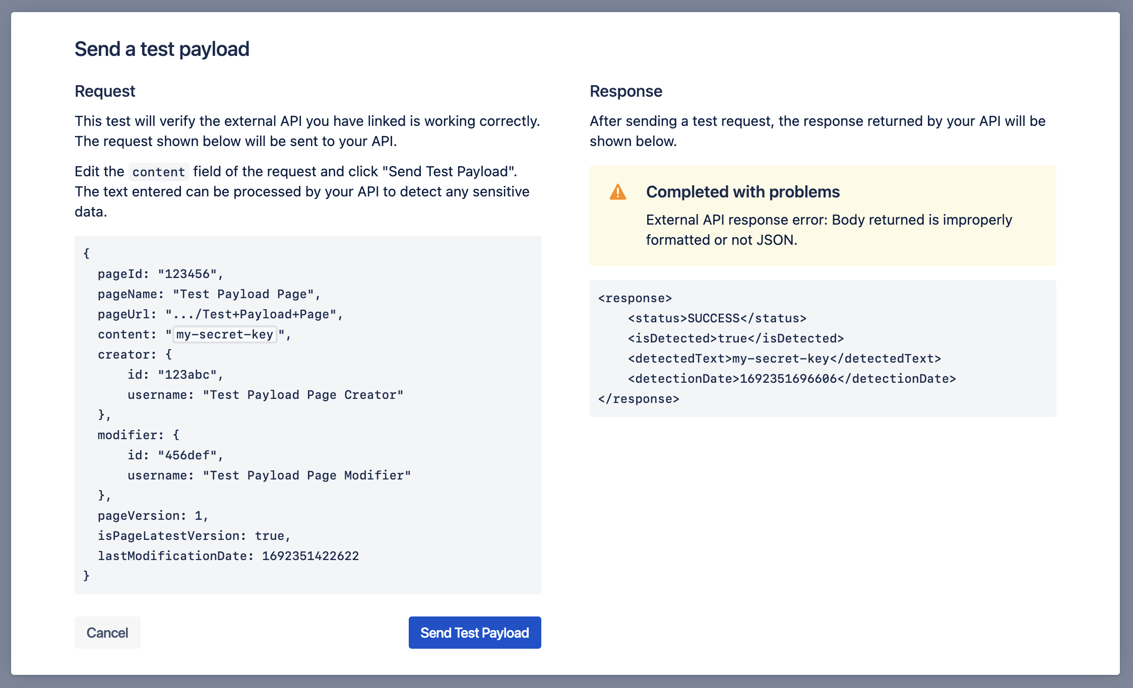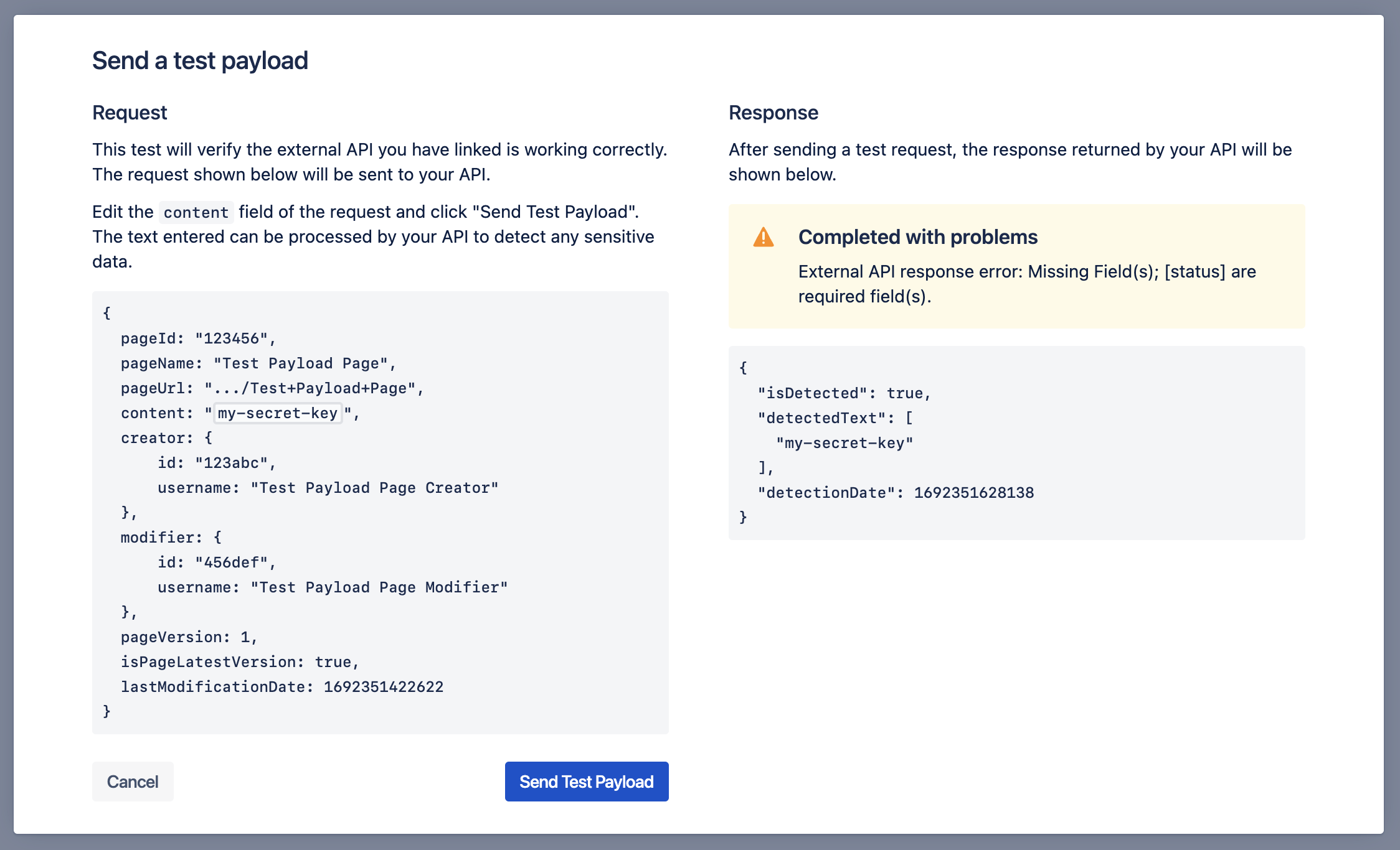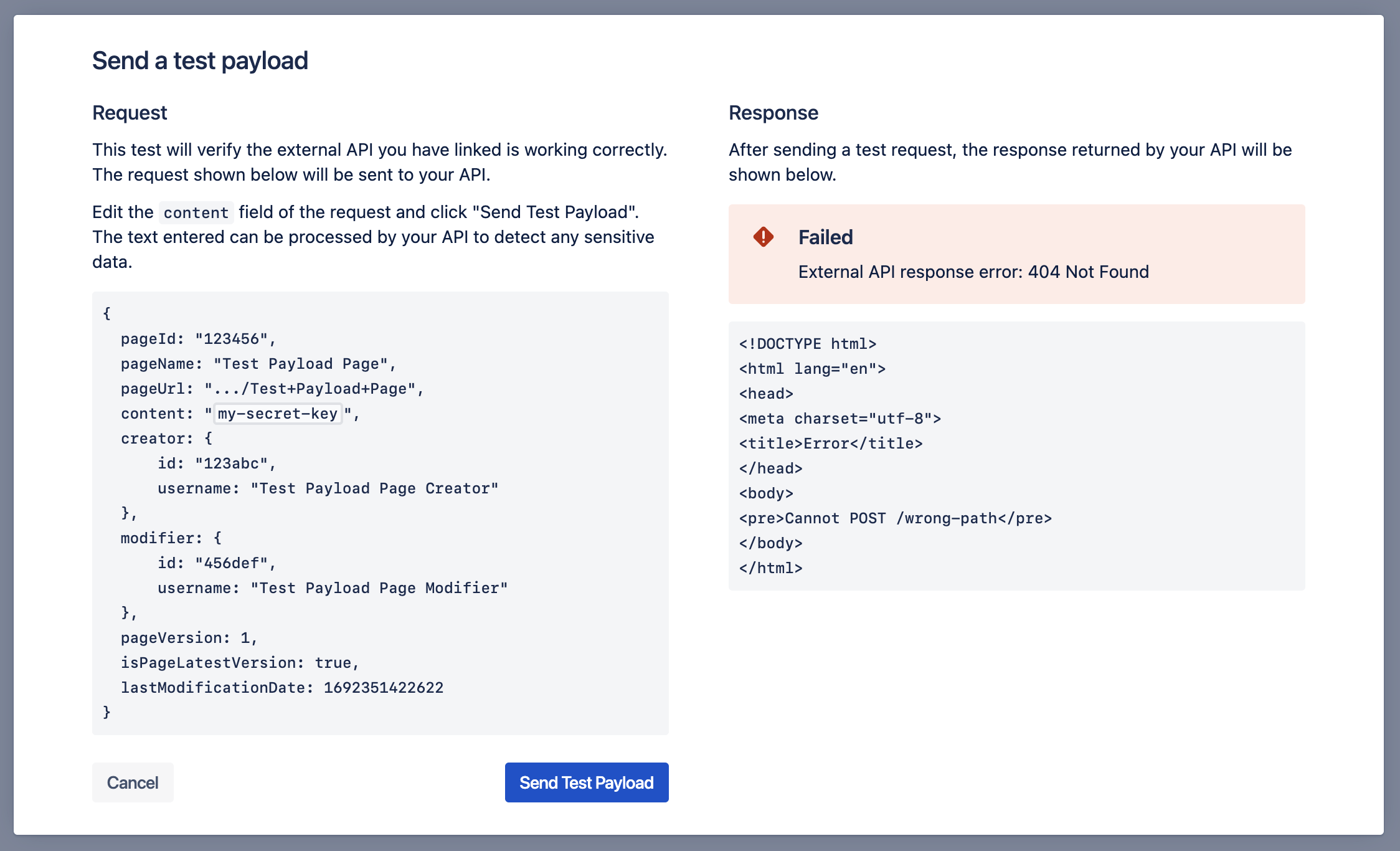 After enabling and configuring an External API from within Compliance for Confluence, you can send a test payload to your API to verify its response. If you have not yet configured your API, please refer to Using an External API for Data Detection.