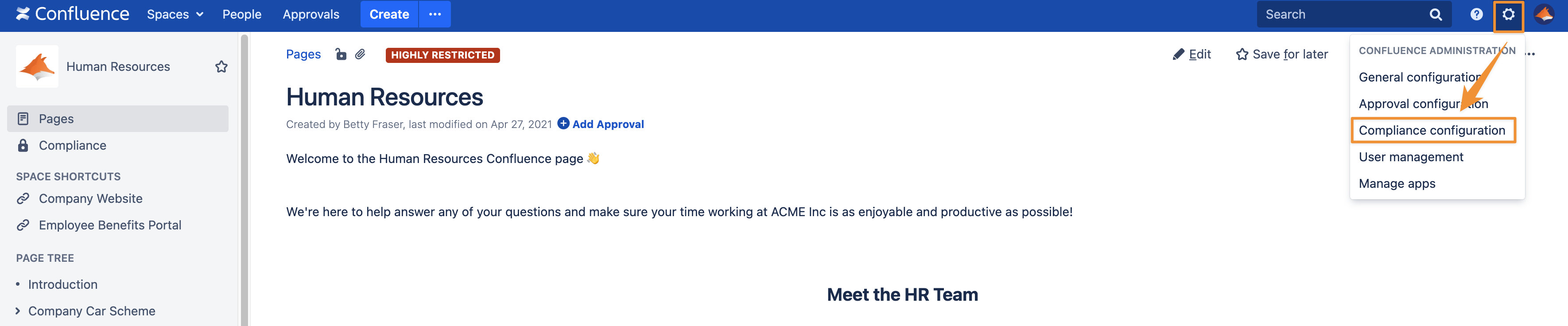 The global default classification feature is available in the Compliance configuration settings as shown by following the steps below. Please note you will need to be a Confluence site admin to access this.