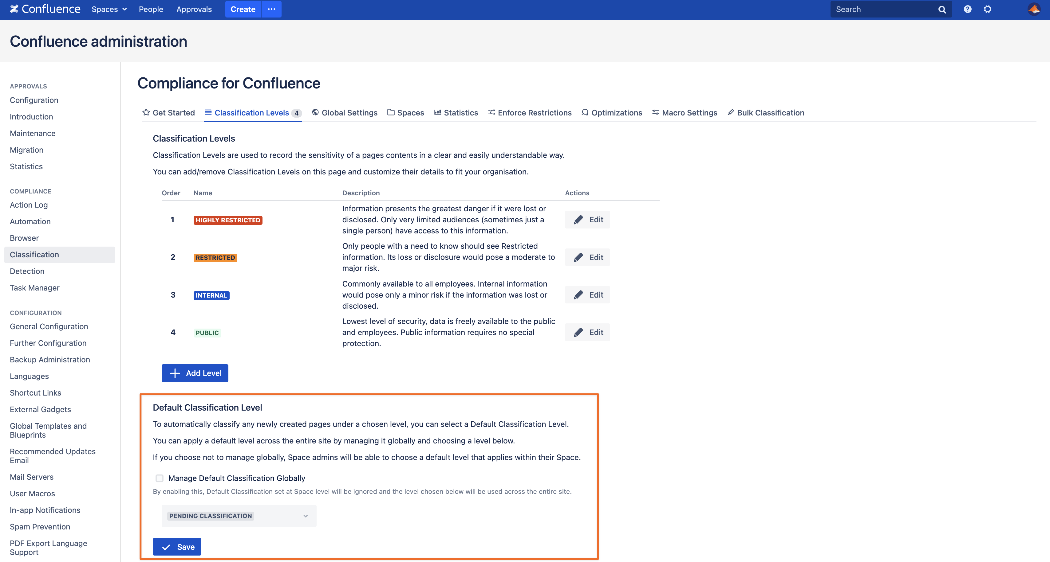 Compliance for Confluence allows you to set a default classification level that will be used every time a new page is created or published. Using this feature will prevent pages from being labelled as “Pending Classification” when they are first created.